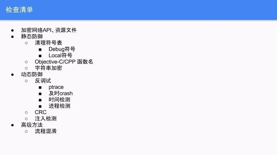 由于这是一个内部分享,所以相关内容并没有公开。不过经过我和 h4x 的协商,他答应将他的 PPT 分享给大家。感兴趣的同学可以从他的 PPT (特别是倒数第二页)上,学到一些 iOS 安全的技巧。
