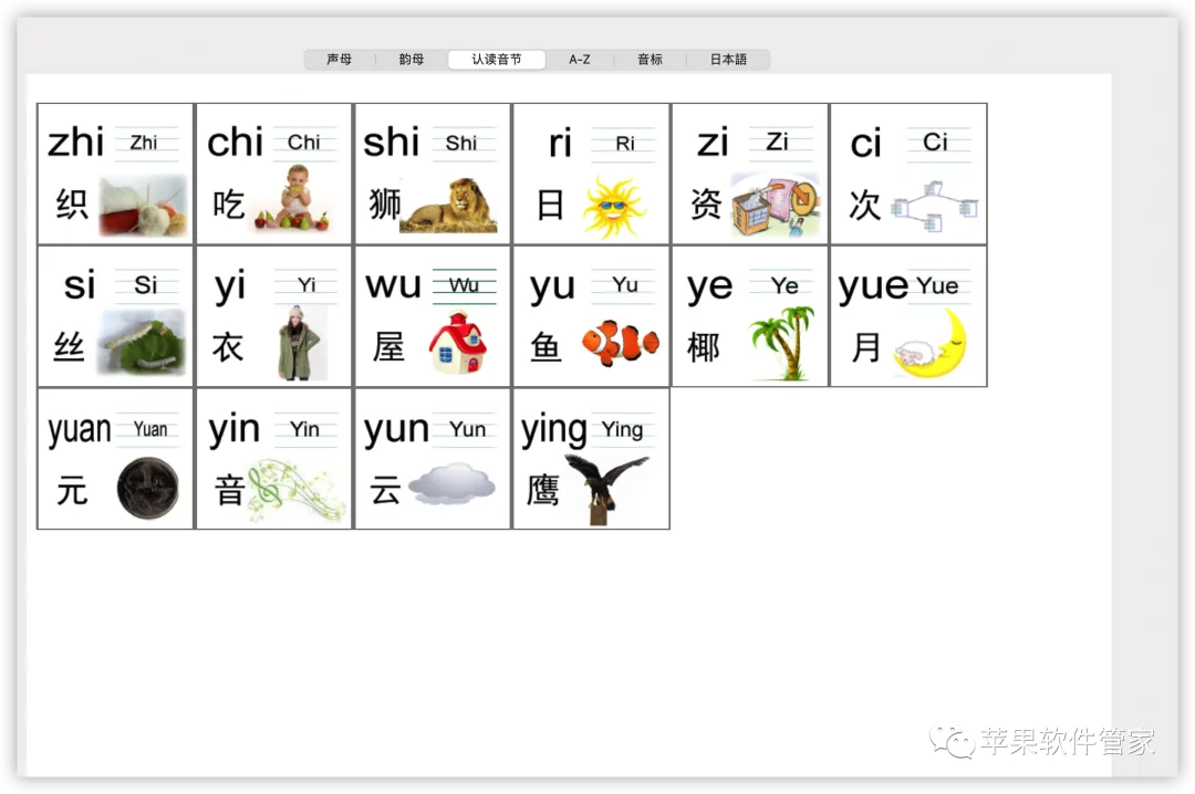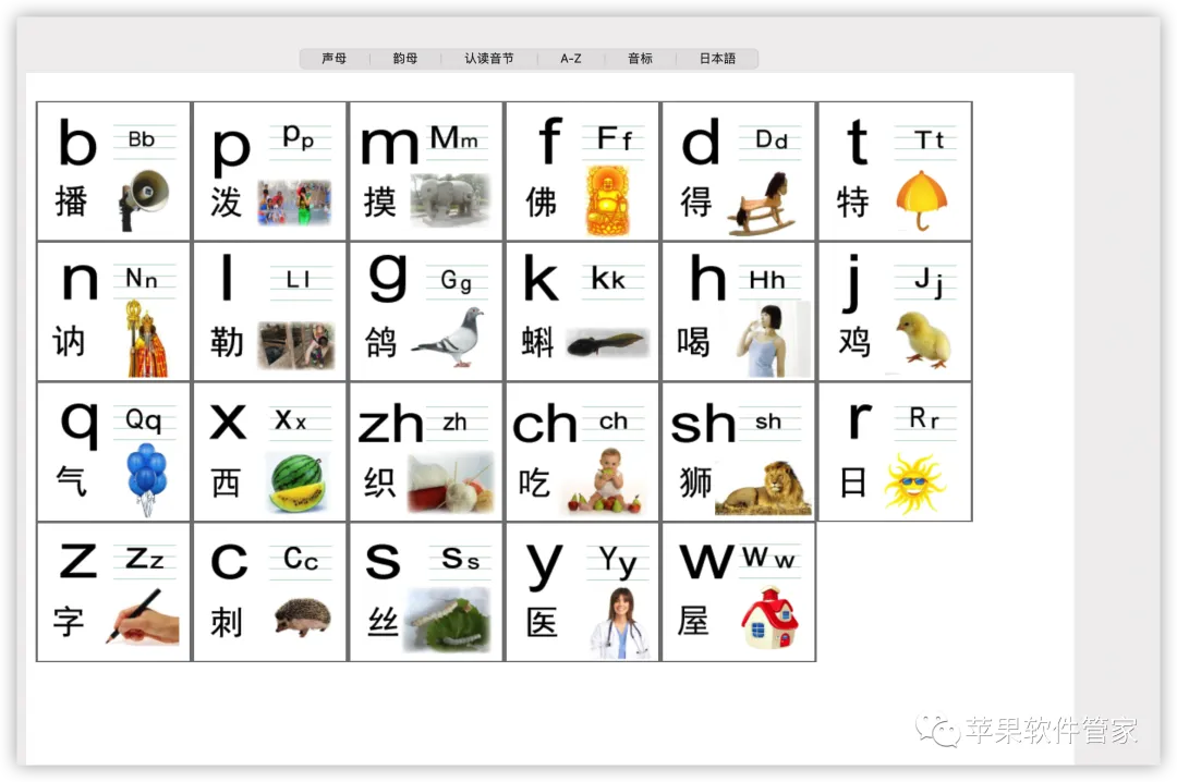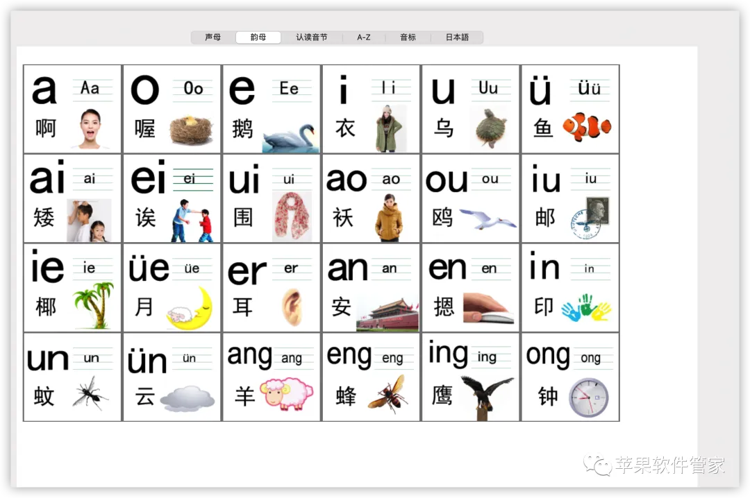 本文最后更新于2026-01-02,某些文章具有时效性,若有错误或已失效,请在下方留言或联系老夜。 年后第一款iOS软件!开启2022新的篇章 苹果软件管家 每个果粉都应该关注的一个公众号 关注苹果软件管家 你可以获取少有人知的苹果软件和技巧 长按下方卡片添加有留言的公众号 ▼ 今天已经是正月初五了 我的好多朋友在初三就开始上班了 管家今天开始上班了 每年回家都难免会有很多话题交流 婚姻、教育、财富、孩子 大家都很后悔当初没有坚持下来认真读书 趁着春节后第一期更新 这一期管家从一款学习软件开启2022新篇章 PinYin 学拼音声母韵母学习软件 (Mac·免费·无广) PinYin是一款Mac上适合孩子学习的软件 能够教你的孩子如何读声母 韵母以及整体认读音节 包括日语五十音、英语48个国际音标 以及26个字母 能够实现点击那个就读哪个 软件完全免费 打开后界面非常清爽、占用内存也不大 配有图片让孩子更容易听懂 很多孩子不好好学习 基本都是靠父母严厉的责骂 可能这也许这就是我们教育方法的不对 可以试试这种软件教学的方法 不过测评下来我觉得这个软件发音不是太好听 如果可以自定义发音人就好了 当然你也可以让孩子从小学习 24个音文字母和音标 管家想吐槽的是为啥要增加日语 日语这个部分我们就不用看了 因为基本对于我们普通人而言这辈子都不会学的 最后还是祝大家2022都能有个好的开始 热门推荐 苹果发布12张iPhone专属生肖壁纸 QQ音乐里面的周杰伦歌曲,能免费听了 《长津湖之水门桥》真的太好看了 软件下载 有需要这款应用的果粉们 关注管家的公众号【苹果软件管家】 后台回复【拼音】即可获取