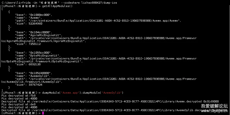 首先我们进行静态分析,第一步要脱壳,常见的工具有dump-decrypted/frida-ios-dump/clutch等工具。先来看看App哪些模块需要脱壳,从下图可以看到App内部模块有Aweme,AwemeDylib和两个第三方Rtc库,对这两个动态库进行脱壳,然后拖到IDA分析。