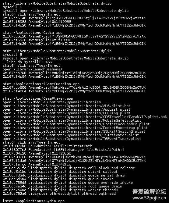 使用frida对常用越狱检测函数对应的系统调用进行跟踪access,creat,faccessatgetxattr,getxattr,link,listxattr,lstat,open,opendir,readlink,realpath,stat,statfs,symlink,这样可以检测到所有函数级
