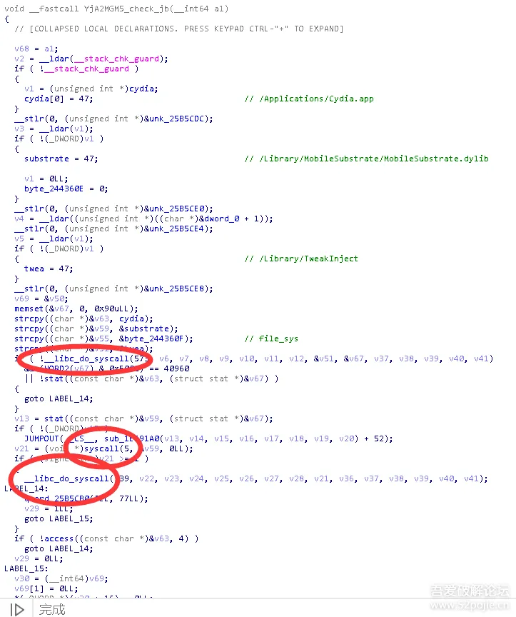 经过分析可知,App存在SVC指令级别的越狱检测并封装成函数__libc_do_sycall,同时也调用了syscall函数来隐藏api调用。通过跟踪__libc_do_sycall和iOS系统调用号,可以发现的系统调用有: