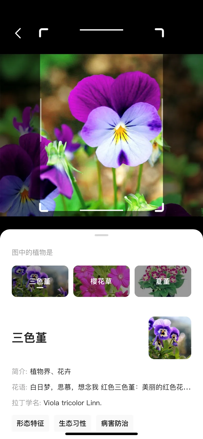 像我这样,点击夸克首页的相机按钮,对着不认识的花拍一张照片,它的学名及详细信息就出来了。