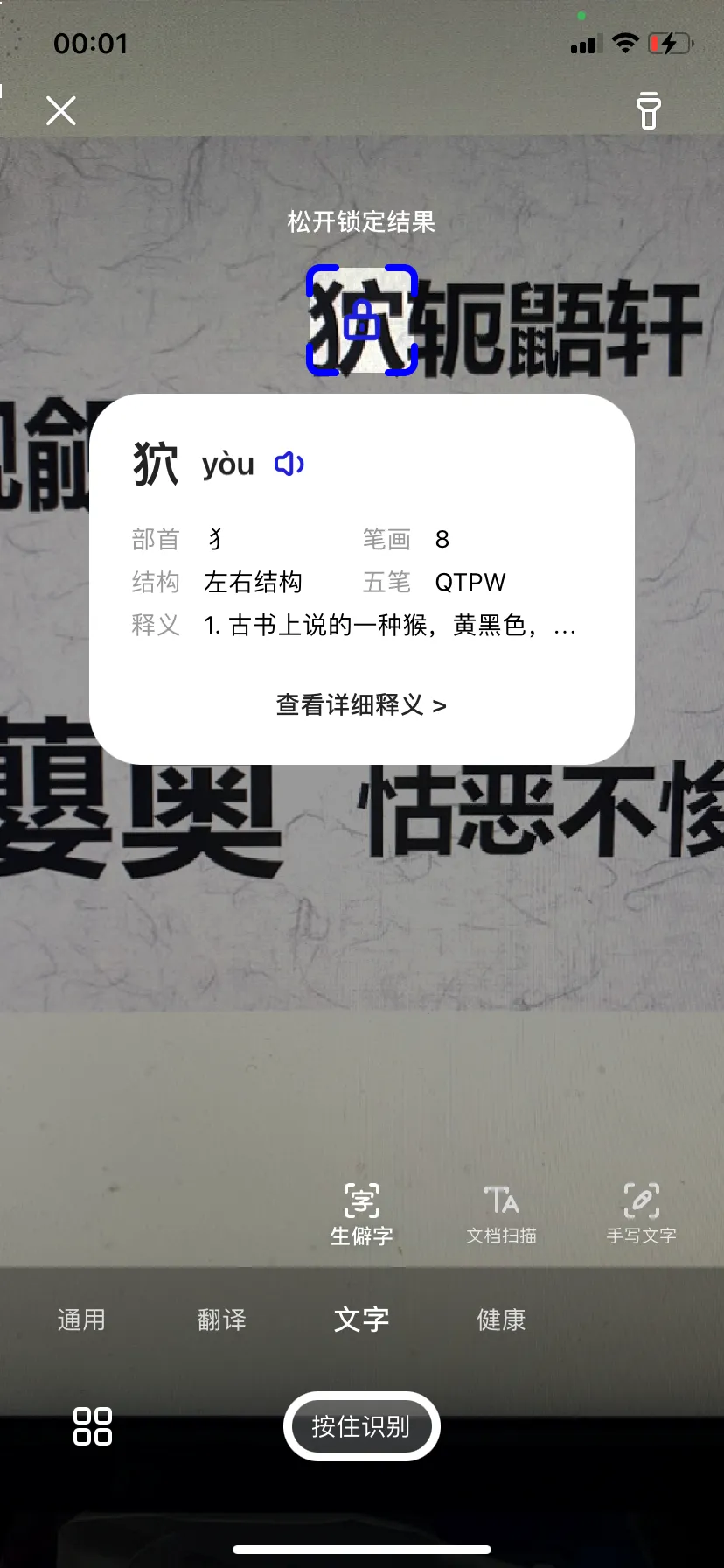 不认识的字,也是一拍就能解决,甚至是读音、释义、部首等信息通通搞定。