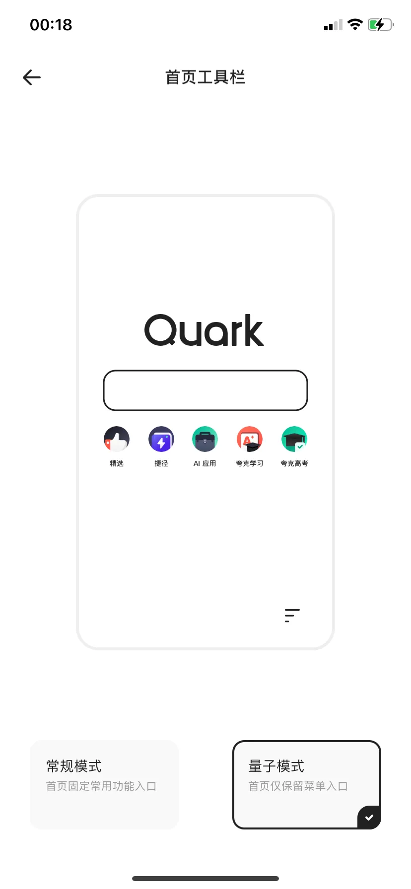 在 5.0 版本当中,打开设置,找到夸克实验室,在里面选择量子模式,这样在首页就只会保留菜单入口,其余的底部导航都会帮你关掉。
