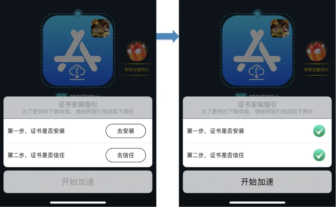 ☆(这一步需要安装以及信任证书,点击后会出现具体教程,当页面下方出现下图显示的两个绿色的勾选标识的时候,就可以开始加速啦,对于厉害的特种兵们来说,这很简单的哟~)