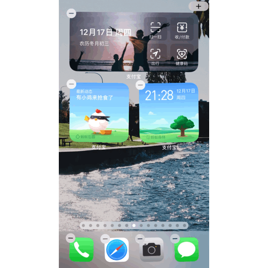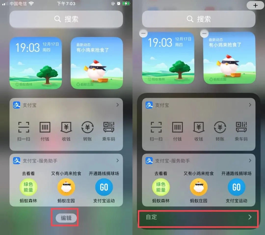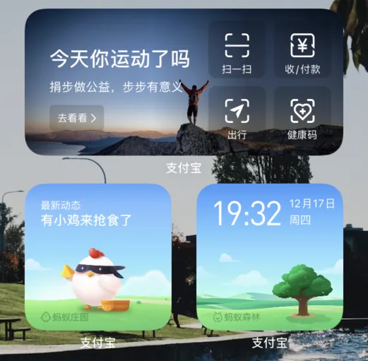 下面两个正方块的小组件,是专门为收能量、养鸡爱好者们准备滴~机哥就是加了一堆支付宝好友,每天互相偷能量和养小鸡。