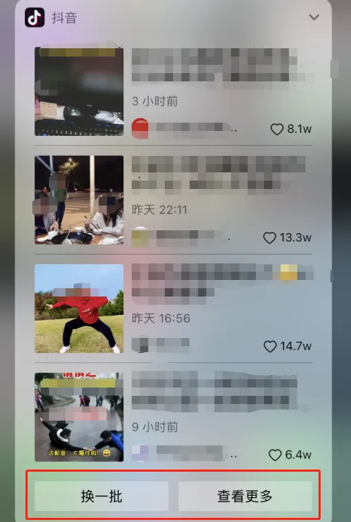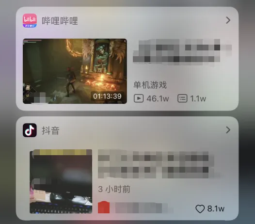 其他的像 B 站、抖音这些娱乐刷视频的 App,直接添加小组件的话,也只是简单的推荐视频轮播而已。