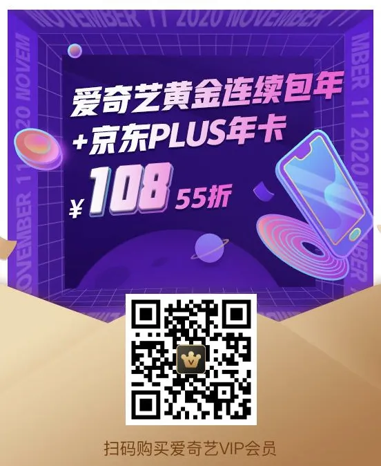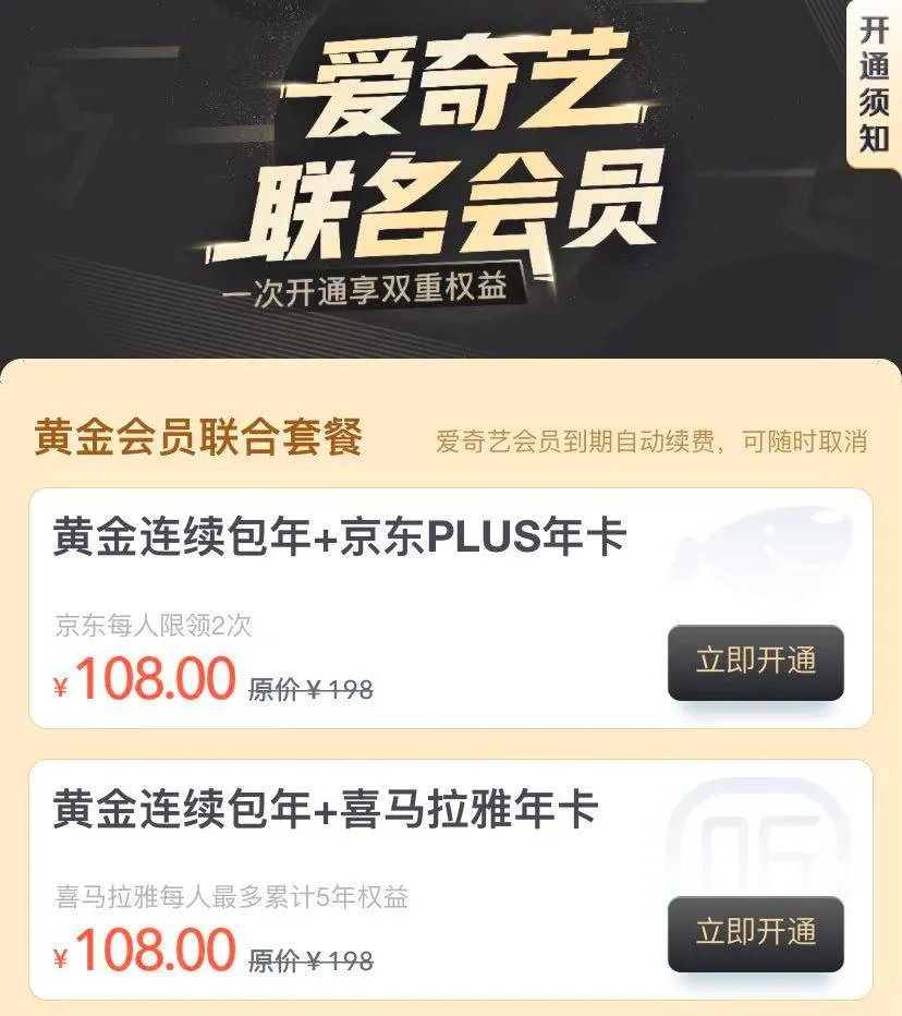 5折108元=1年爱奇艺VIP+1年京东PLUS