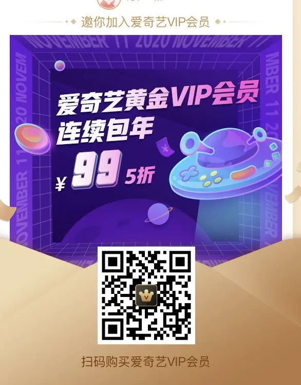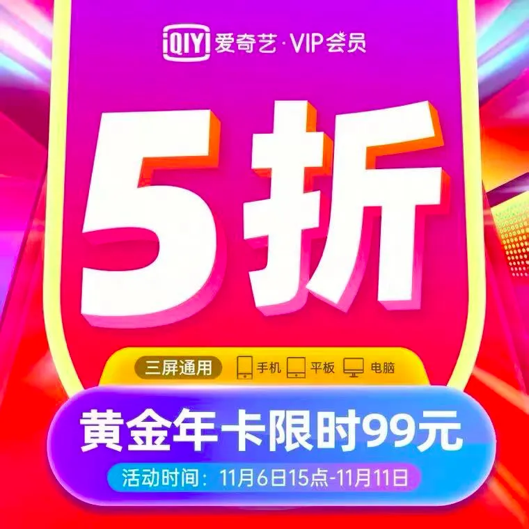 5折99元=1年爱奇艺VIP。官方旗舰店活动,靠谱。也有季卡可以选择。几乎秒到。有需求的小伙伴不要错过。