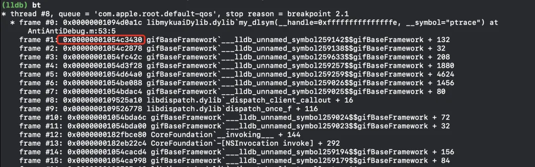 App运行起来后,将在my_dlsym函数断下来,然后bt打印调用栈: