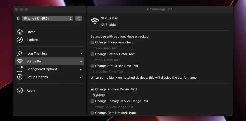 首次发布 Cowabunga Lite Windows 版工具,可能没有探索和状态栏选项,因为它们转换成 Windows 上一直出现问题,目前仍然解决中,具体会不会在月底发布版本中出现?暂时未知。