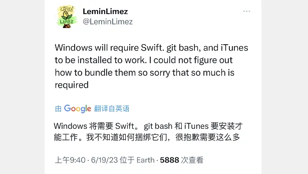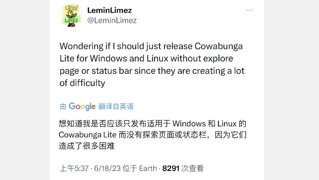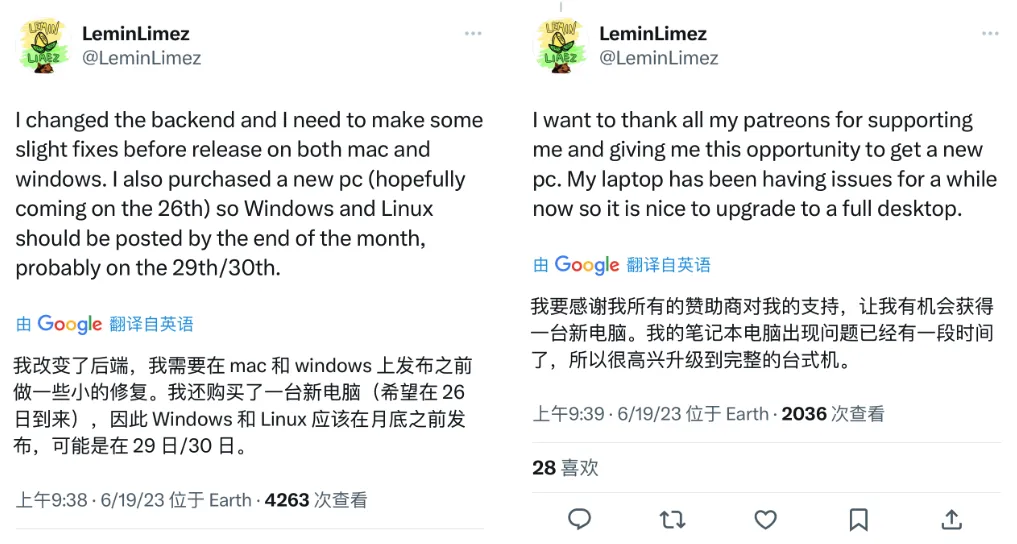 在6月19日上午时段,LeminLimez 在推特发文称,之前希望在26号前发布 Windows 版本,途中因需到一些问题,推迟了,并且还购买一台新电脑,很有可能会在29日或30日发布。