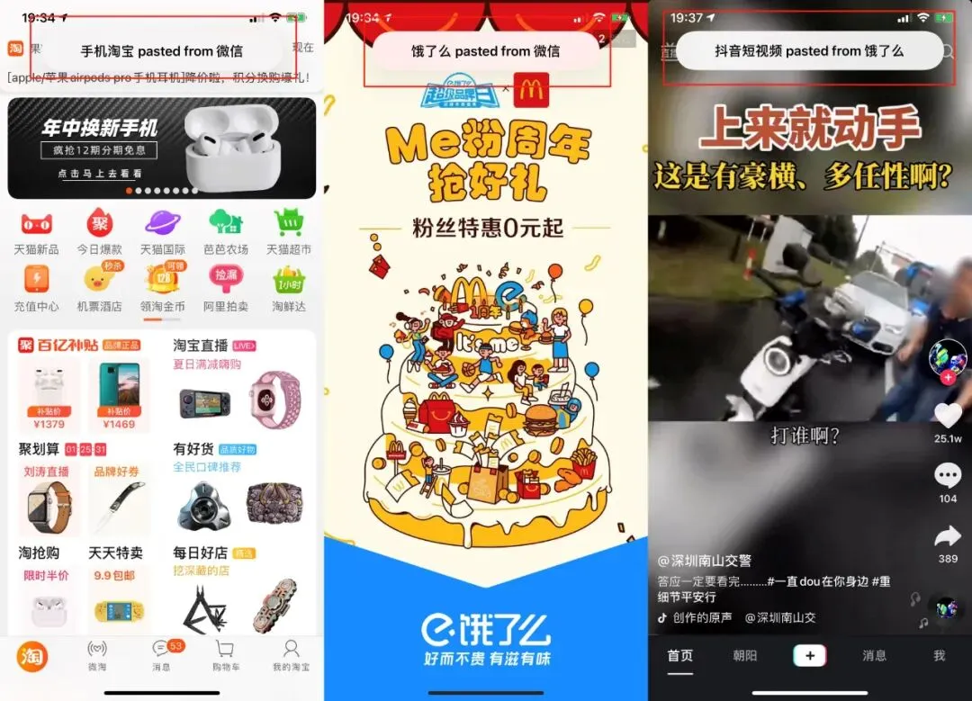 TikTok 并不是唯一一个这么干的 App,根据我的测试,当我每次打开X宝、X了么、X音等 App 时,屏幕上方都会弹出“XX paste from XX”的提醒。当然,它们可能是为了读取“X口令”来打开相关页面,不一定是为了监控。