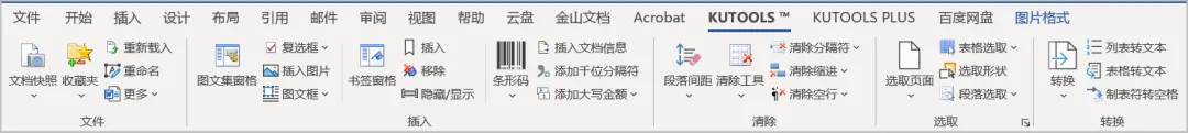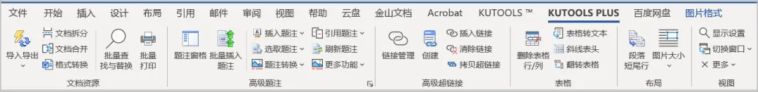 按照文末方式获取软件安装成功后,打开Word,在标题栏中会出现一个标题为KUTOOLS和另一个为KUTOOLS PLUS的新栏目。