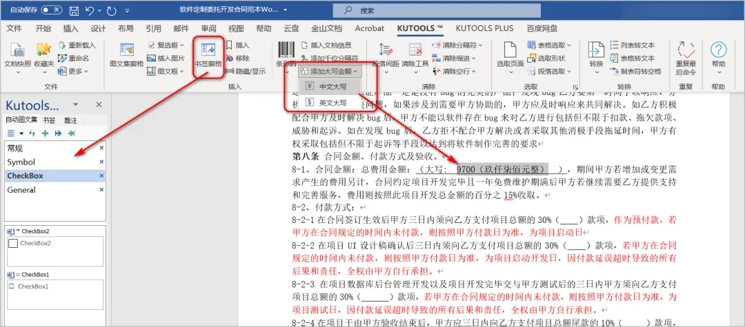 例如“添加大写金额”,可以全篇将数据添加上大写,也可以选定某一区域添加上大写,另外可以将文档添加上书签