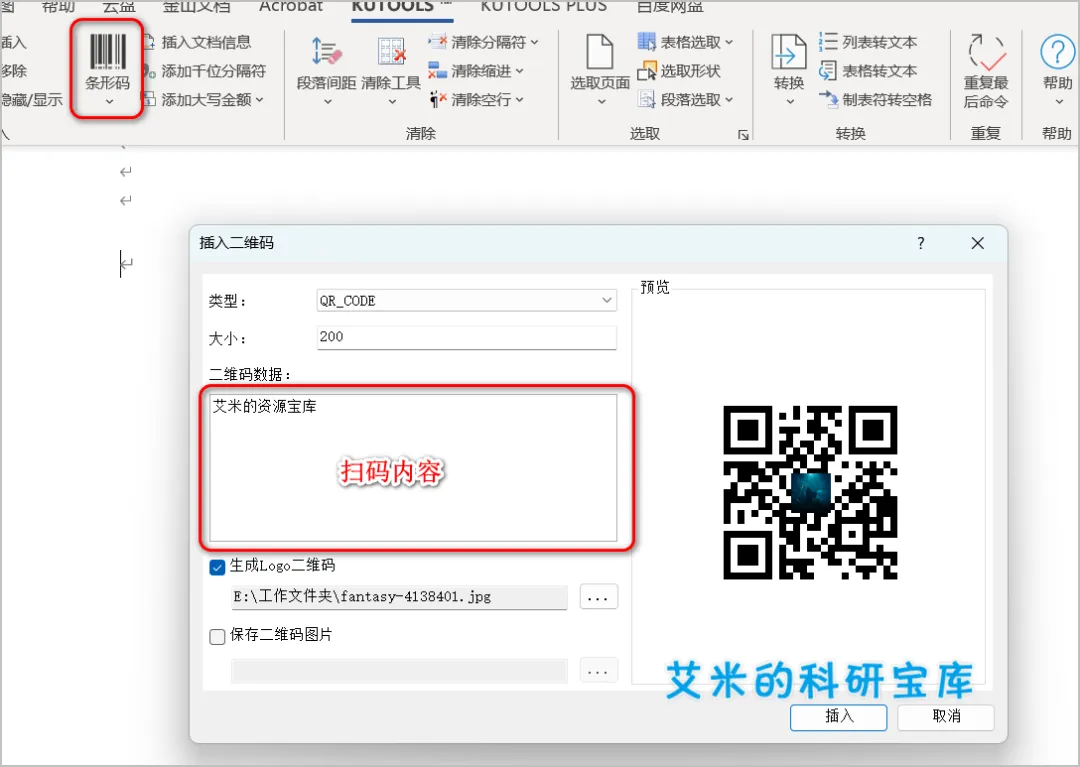 制作二维码,点击条形码下面的插入二维码,可以自由设计二维码,非常好用。