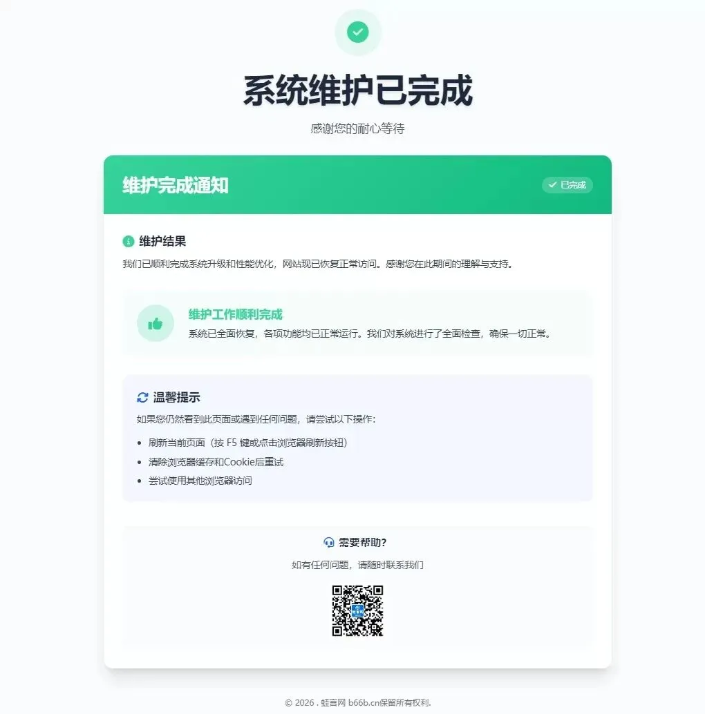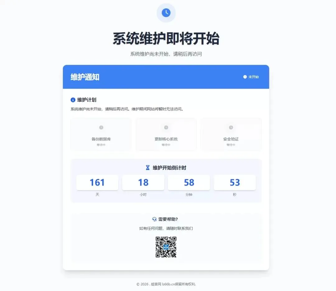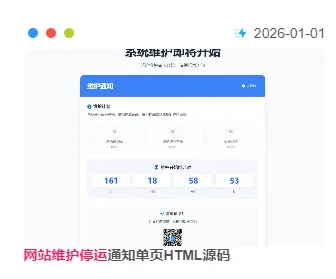 本文最后更新于2026-01-02,某些文章具有时效性,若有错误或已失效,请在下方留言或联系老夜。 网站维护停运通知单页HTML源码 自适应手机和电脑端,页面简洁美观,有三个页面,维护前、维护中、维护完,无后台,内容在首页index文件修改只需要设置好维护开始和结束时间,会自动依次按顺序显示三个页面,倒计时结束后会一直显示维护完成页面 源码下载 此资源免费获取 需要的朋友请移步下面地址 也可点击左下角“阅读原文” https://b66b.cn/6625.html 复制上面地址在浏览器中打开哦 若链接失效,请关注上面公众号 发送 蛙言网 获取最新网站地址 直接进入网站搜索网站维护停运通知