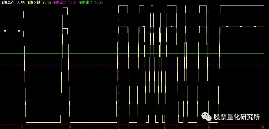 派发区域:IF(VAR1>LLV(LOW,293)*1.45 AND VAR1>LOW*1.3,VAR1*0.82,0);