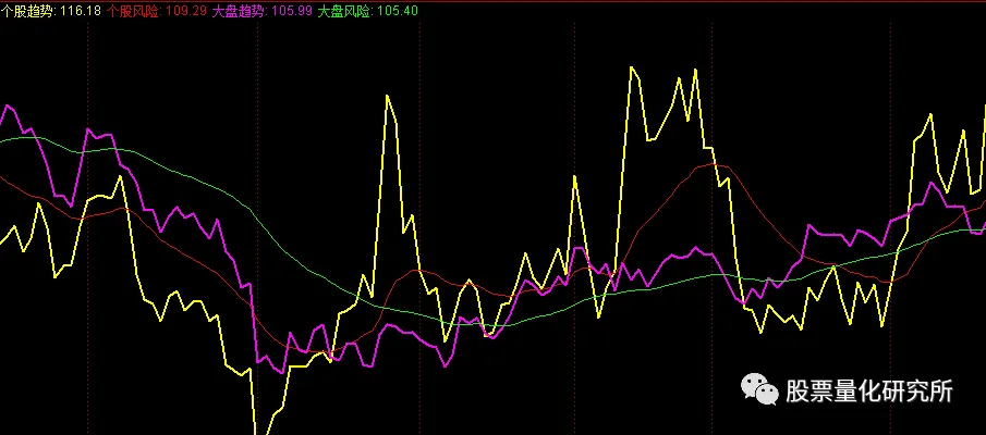 在麒麟短线王中,麒麟趋势指标是一个反映个股对比大盘的指标,我们知道,个股如果有短线资金大力推进的时候,其走势往往会独立与大盘,领先于大盘,在麒麟趋势中,表现个股趋势的是一根粗的黄颜色的线,表示大盘趋势的是一根粗的紫红的线.