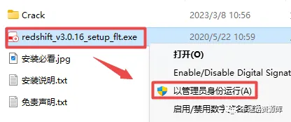 2.打开刚刚解压的文件夹,鼠标右键点击“redshift_v3.0.16_setup_flt.exe”选择“以管理员身份运行”