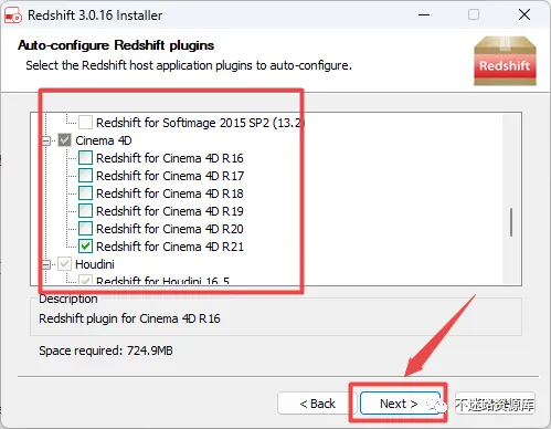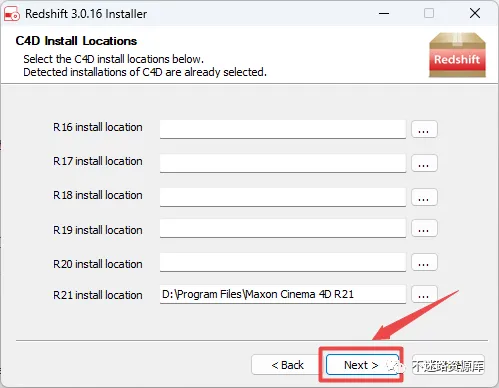 5.自动配置Redshift插件,选择相对应的软件,这里以C4D R21为例,点击“Next”