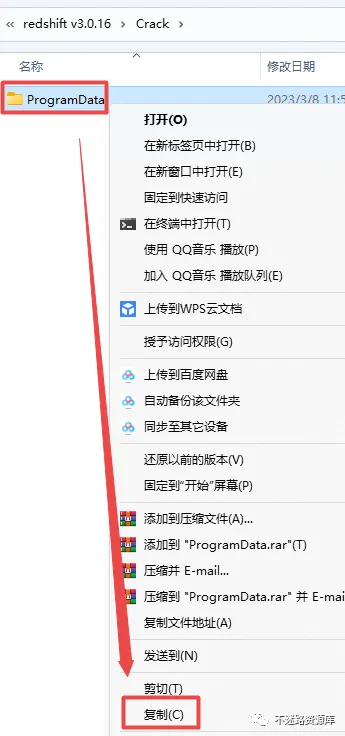 11.返回之前解压的“redshift v3.0.16”文件夹,双击打开“Crack”文件夹,选中“ProgramData”文件夹,鼠标右键选择“复制”