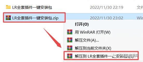 1.选中下载的压缩包,然后鼠标右键选择解压到”LR全套插件一键安装包”(没有解压选项点这里)