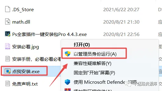 2.打开刚刚解压的文件夹,选中“点我安装.exe”,鼠标右键选择”以管理员身份运行”