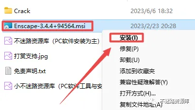 2.打开刚刚解压的文件夹,找到“Enscape-3.4.4+94564.msi”文件,鼠标右键选择“安装”