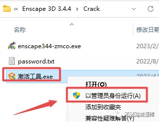 9.返回之前解压的“Enscape3.5”文件夹,双击打开“Crack”文件夹,选中“激活工具.exe”文件,鼠标右键选择“以管理员身份运行”