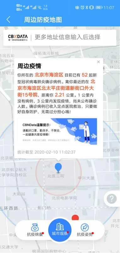 用户可在线查看当前地理位置周边疫情状况,包括最近距离的确诊病例历史出现地点,以及1km、3km半径范围内的疫情动态。定制化防疫地图可有效帮助用户便捷查询所处位置疫情动态,并根据相关情况做好针对性的防护工作。