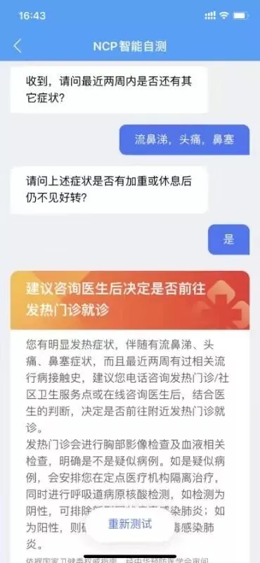 根据国家卫健委《新型冠状病毒感染的肺炎诊疗方案》,可对用户目前身体状态进行智能分析,测试出“新冠肺炎”感染的可能性,并给出相应的建议。不仅帮助用户对自身状况做出科学的初步判断,还通过为用户分级,针对性给出建议举措。对于低危险级别用户,提示全面的个人防护措施;对于中危级别用户,建议在线咨询医生或前往医院就诊;对于高危级别用户,引导及时前往发热门诊并提醒就医防护措施。帮助用户了解自身情况的同时,降低心理恐慌,引导用户针对性开展科学防控工作。