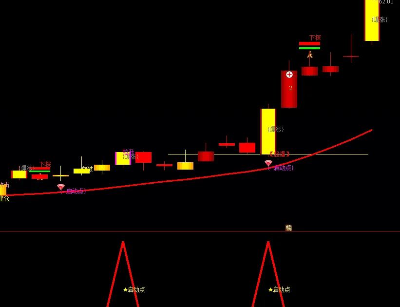 DNCB := 0.04;DNCC := V / ((H – L) * 2 – ABS(C – O));DNCD := IF(C > O, DNCC * (H – L), V / 2);DNCE := MA(DNCD, 35);DNCF := (L + H + C + O) / 3.82;DNCG := HHV(MA(DNCF, 6), 15);DNCH := MA(C, 30);DNCI := DNCH + 2 * STD(C, 30);DNCJ := EMA(C, 5);DNCK := C > DNCI AND C >= O;DNCL := BUYVOL > DNCB * CAPITAL;DNCM := 100 * V / (FINANCE(7) / 100) > 4 OR V / REF(V, 1) >= 2;DNCN := DNCD > DNCE AND CROSS(C, DNCG) AND DNCK AND DNCM;DNCO := COUNT(DNCN, 10) >= 1;DNCP := COUNT(DNCD > DNCE, 30) >= 15;DNCQ := REF(C, 1) / LLV(L, 15) <= 1.4 AND REF(COUNT(C / REF(C, 1) >= 1.092, 10), 3) < 2;DNCR := MA(L, 20) * 1.2;DNCS := MA(L, 8) * 1.1;DNCT := DNCR > REF(DNCR, 1) AND C / REF(C, 1) >= 1.09 AND DNCD > DNCE AND DNCQ;DNCU := CROSS(C, DNCR) OR CROSS(C, DNCS) AND DNCT AND DNCP AND DNCO AND DNCL;DNCV := FILTER(DNCU, 6);DNCW := DNCN AND DNCO;IF(DNCW, 2, 0), COLORRED, LINETHICK4;IF(DNCW, 1, 0), COLORBLACK, LINETHICK3;DRAWTEXT(DNCW, 0.9, ‘★启动点’), COLORYELLOW;