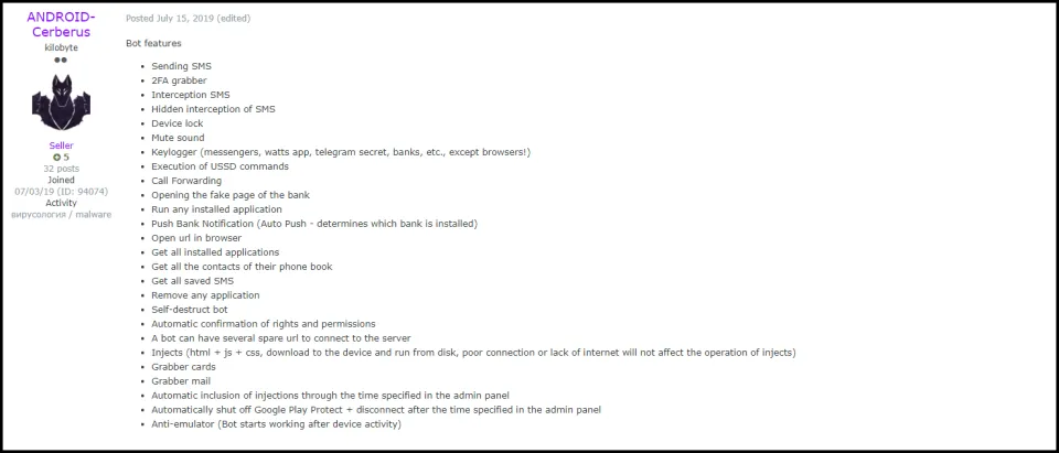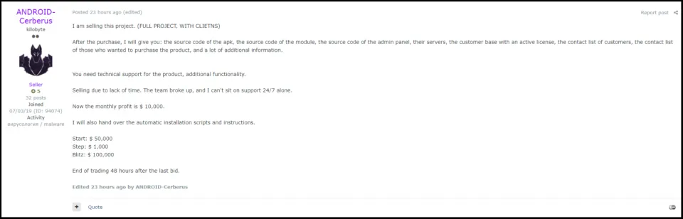 为了吸引潜在的竞标者,卖家在拍卖帖子中声称,此 Android 恶意软件每月可产生 10,000 美元的利润。与 Cerberus 维护者达成协议的买方将获得恶意 APK 的源代码以及模块、管理面板和服务器。公告提到,Cerberus 的团队已经解散,无法提供 7×24 小时的技术支持,所以打算连同服务器一块卖掉,让其他人来进行运营。