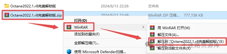 1.选中下载的压缩包,然后鼠标右键选择解压到”Octane2022.1.r8完美解锁版”(没有解压选项点这里)