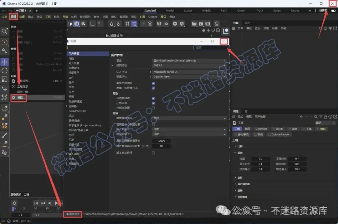22.打开C4D软件,依次点击”编辑-设置-打开配置文件夹“打开目录文件夹,然后退出C4D软件