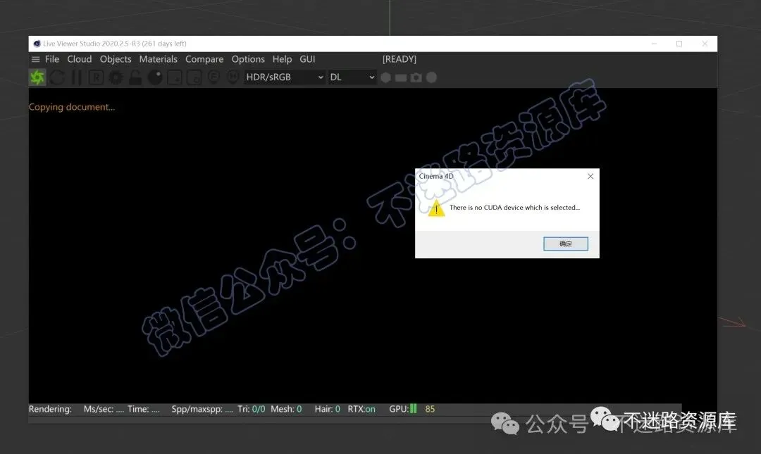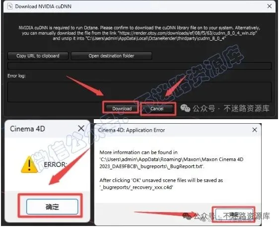 9.此时跳出”Download NVIDIA cuDNN“窗口,选择点击“Download”,稍等几秒,等软件自动建立对应路径的文件夹,方便自己放文件,然后点击“Cancel”,点击“确定”,多次跳出请重复操作退出C4D软件(此版本OC Dmeo 需要cudnn_8_0_4的文件以使用Nvidia显卡)