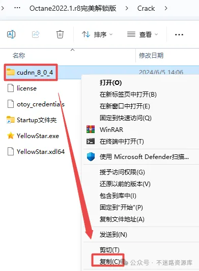 10.返回“Octane2022.1.r8完美解锁版”文件,双击打开”Crack“文件夹,选中”cudnn_8_0_4“文件夹,鼠标右键点击“复制”