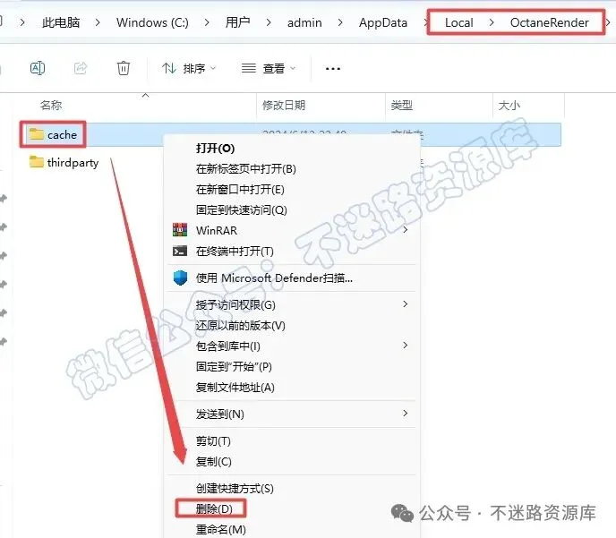 12.依次打开”Local——OctaneRender”文件夹,选中”cache“文件夹,鼠标右键点击“删除”(默认路径:C:\Users\[电脑用户名]\AppData\Local\OctaneRender)