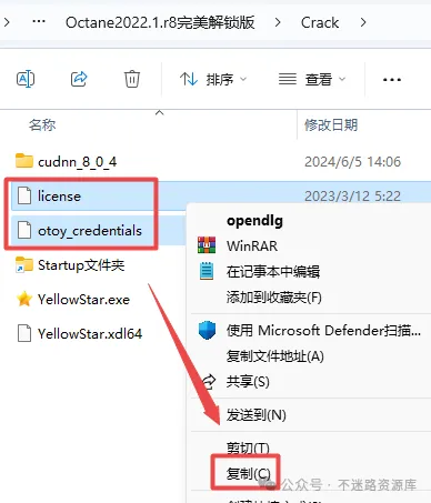 14.返回”Crack“文件夹,选中”license“和”otoy_credentials”两个文件,鼠标右键点击“复制”
