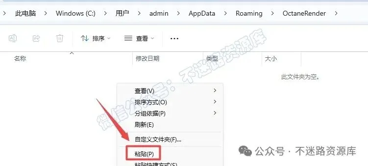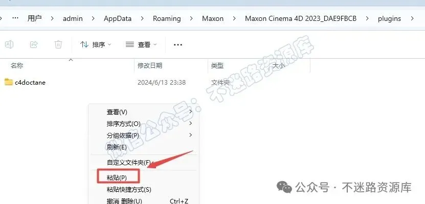 7.首先清除plugins文件夹下所有的Octane插件文件(若有),在文件夹空白处,鼠标右键选择“粘贴”复制的”c4doctane“文件夹(不要关闭此文件夹界面)