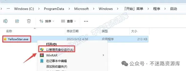 20.完成粘贴操作之后,鼠标右键点击“YellowStar.exe”选择“以管理员身份运行”,没有界面(只需要在任务管理器(ESC+Shift+Ctrl)里面看到 “YellowStar”进程运行即可)