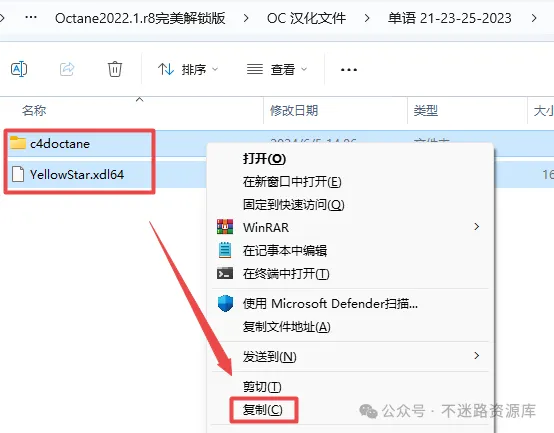 21.返回“Octane2022.1.r8完美解锁版”文件,依次打开”OC 汉化文件—单语 21-23-25-2023“文件夹,选中该文件夹下的全部文件,鼠标右键点击“复制”