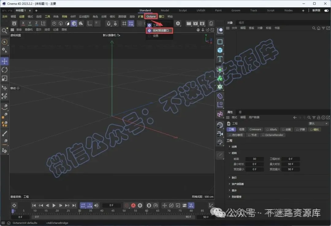 26.重新打开C4D软件,在菜单栏依次选择“Octane-实时预览窗口“