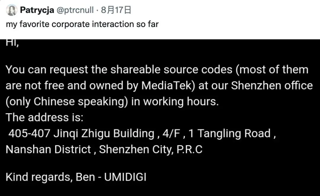 Umidigi 的员工 Ben 在邮件中称(大意),“源码可以给你,但你必须要上门来拿,公司在深圳,我们办公时间只讲中文。”