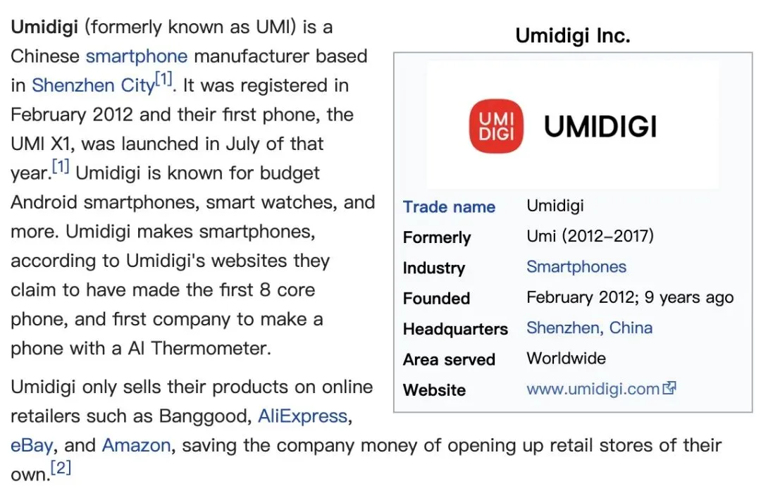 Umidigi 是一家位于深圳的智能手机厂商,成立于 2012 年。Umidigi 做的是国外市场,主打经济型 Android 手机/手表等智能设备。