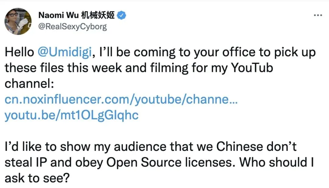 8 月 17 日晚 9:31,Naomi Wu 在推上对 Umidig 喊话,表示本周会上门拿源码文件,还会把过程拍成视频放 YouTube 上。