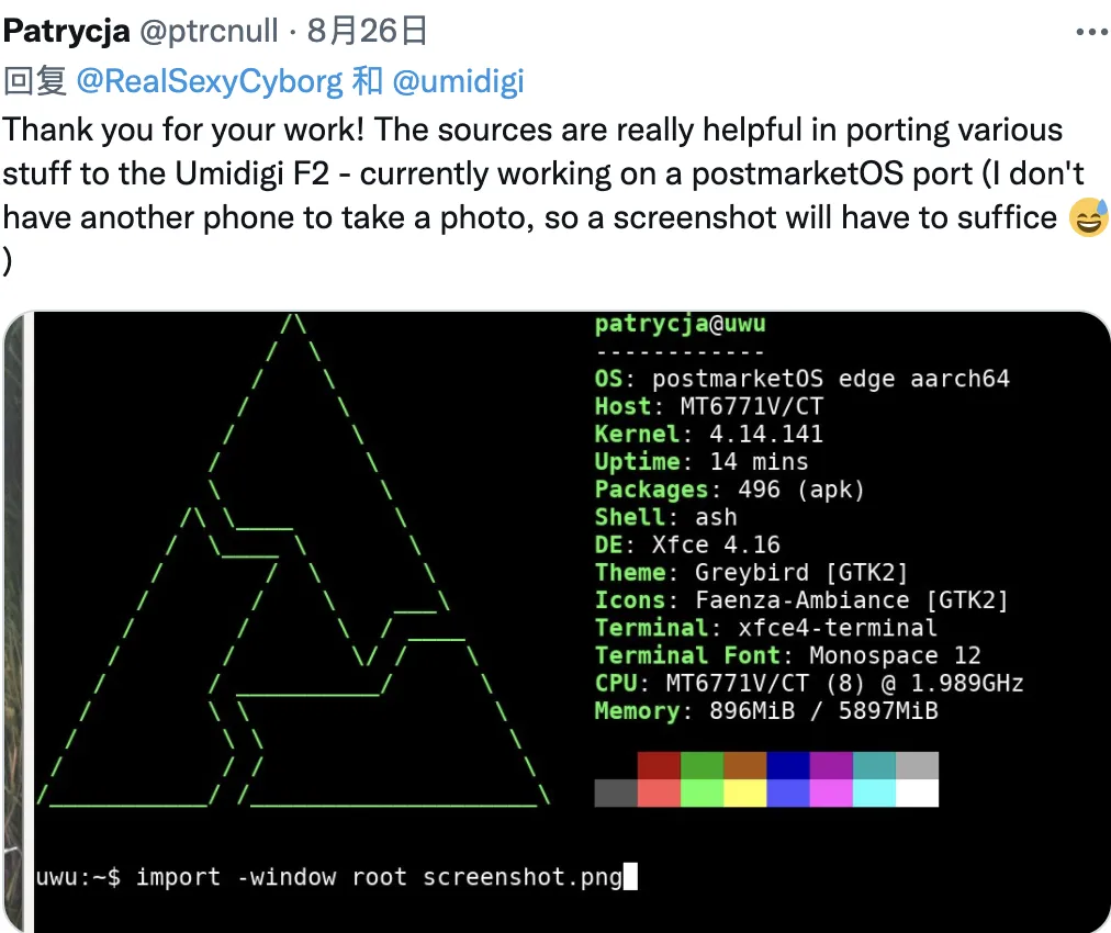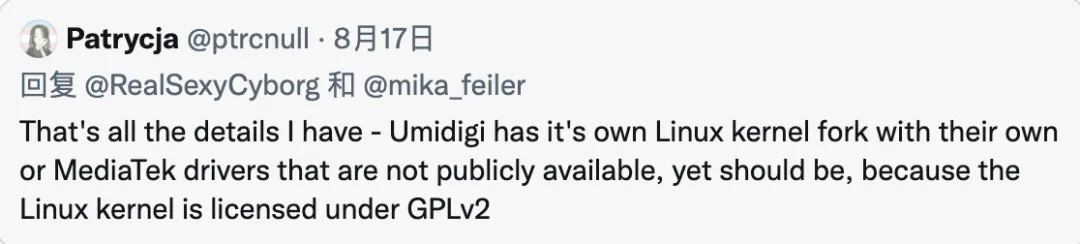 这就是我所知道的所有细节:Umidigi 有它自己的 Linux 内核分支,还有它们自己的或联发科驱动程序。但是驱动程序还没有公开,按理应该是公开的,因为 Linux 内核是遵循 GPLv2 下许可的。