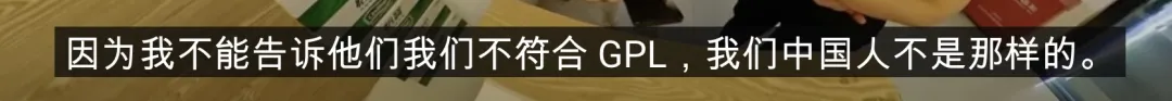 “我想告诉大家,我们中国人不会窃取知识产权(IP),并且遵守开源许可。我应该找(贵公司的)哪位?