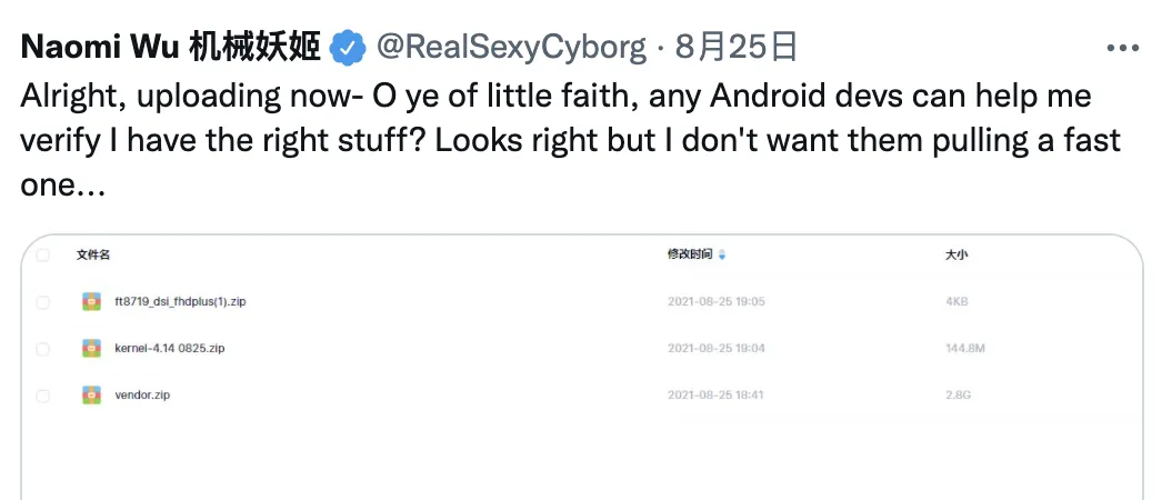 拿到文件后,25 日 Naomi Wu 还发推,寻求安卓开发者的帮助,以确认她拿到的文件是否正确。